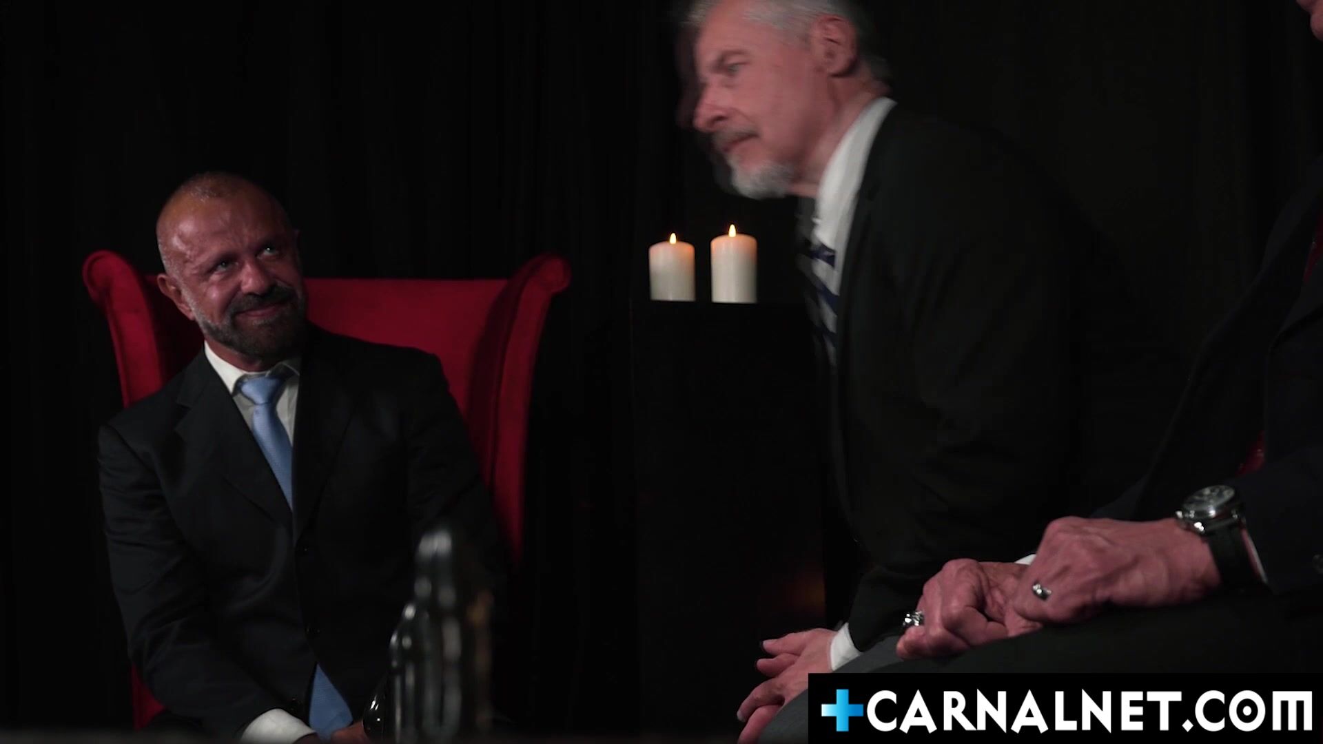 In a ritual of obedience apprentice Kyle Harper stands before stern lecturers Felix Kamp Jay Stryker Patriarch Smith and Reece Scott Wearing suit he bows obediently Unclothed to panties tested Bare he suffers ordeal sitting on row of fake penises