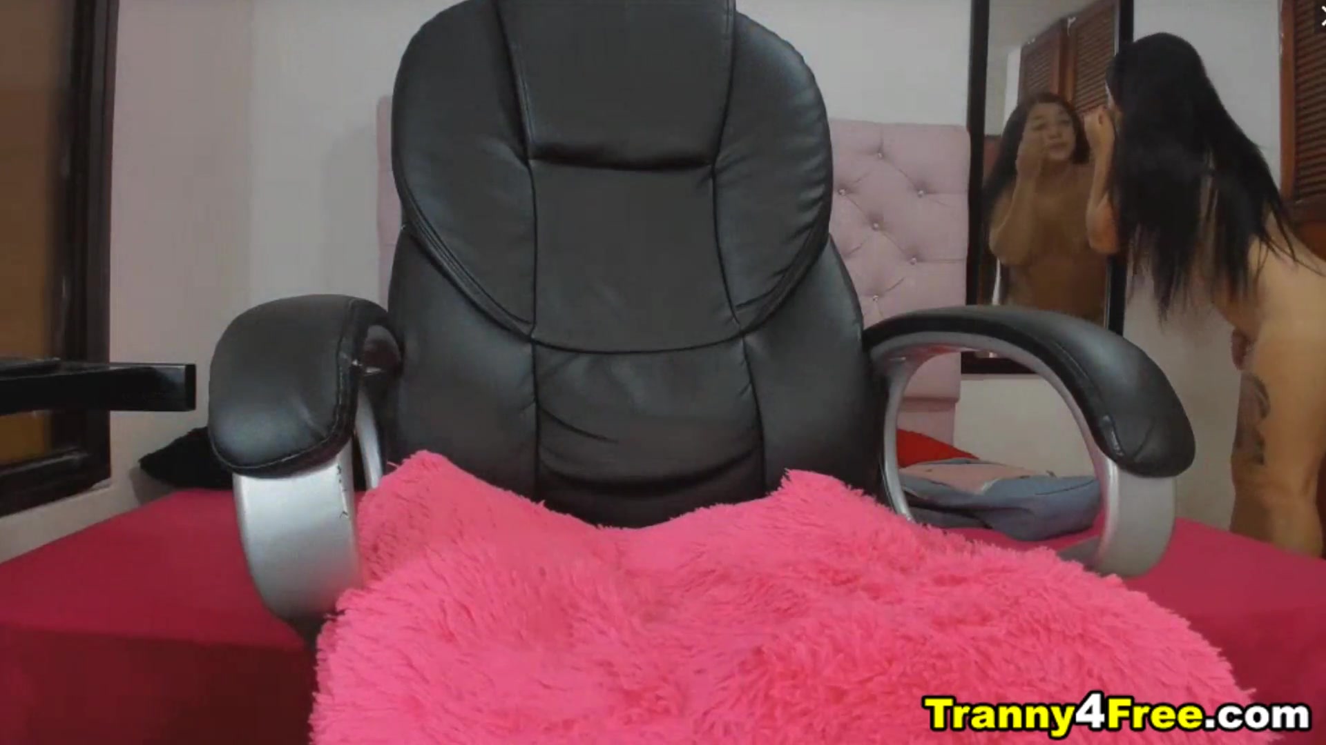 Thai shemale cums in her hand on solo webcam show