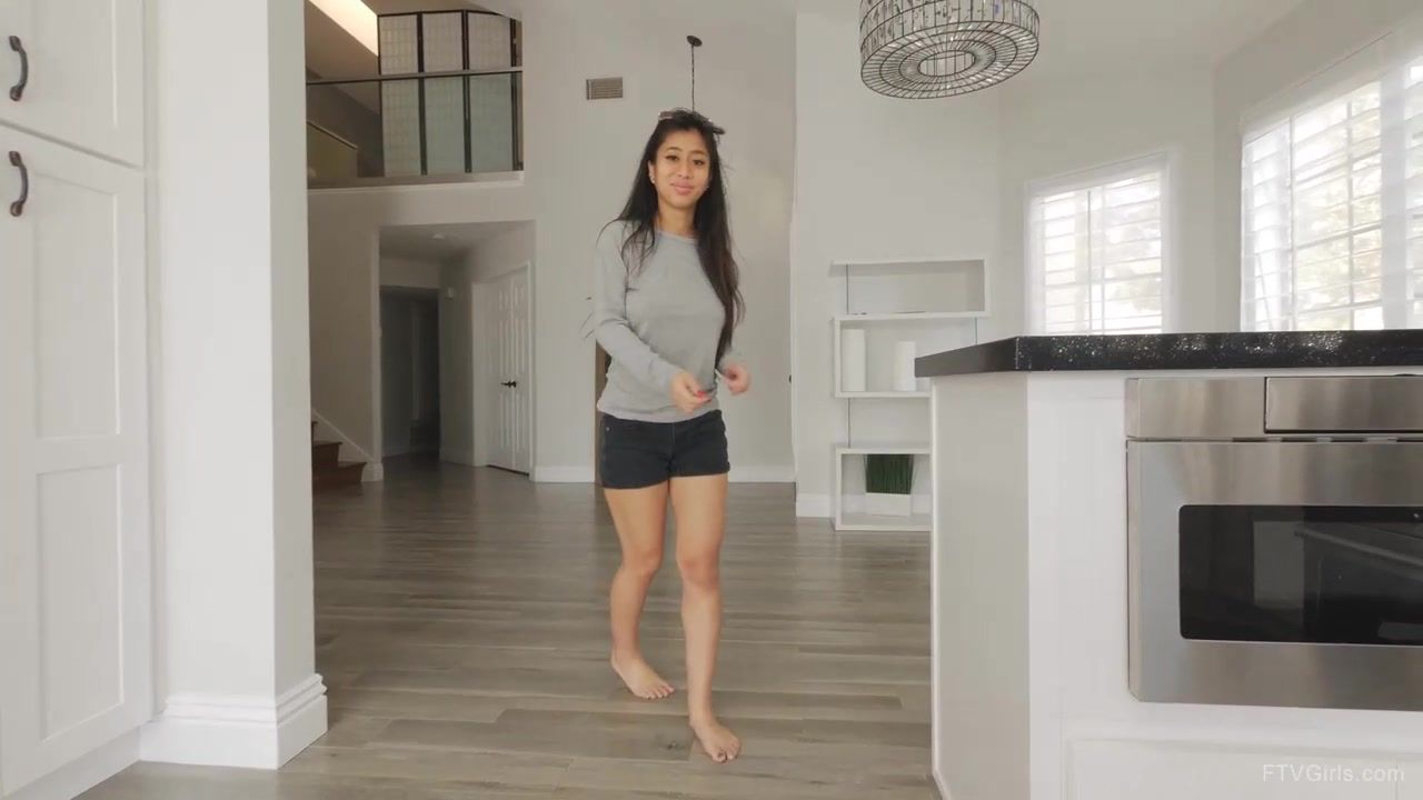 Japanese dark haired with fat mounds is about to take off her clothes and jack in the kitchen