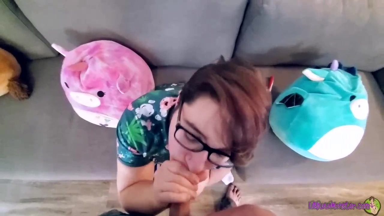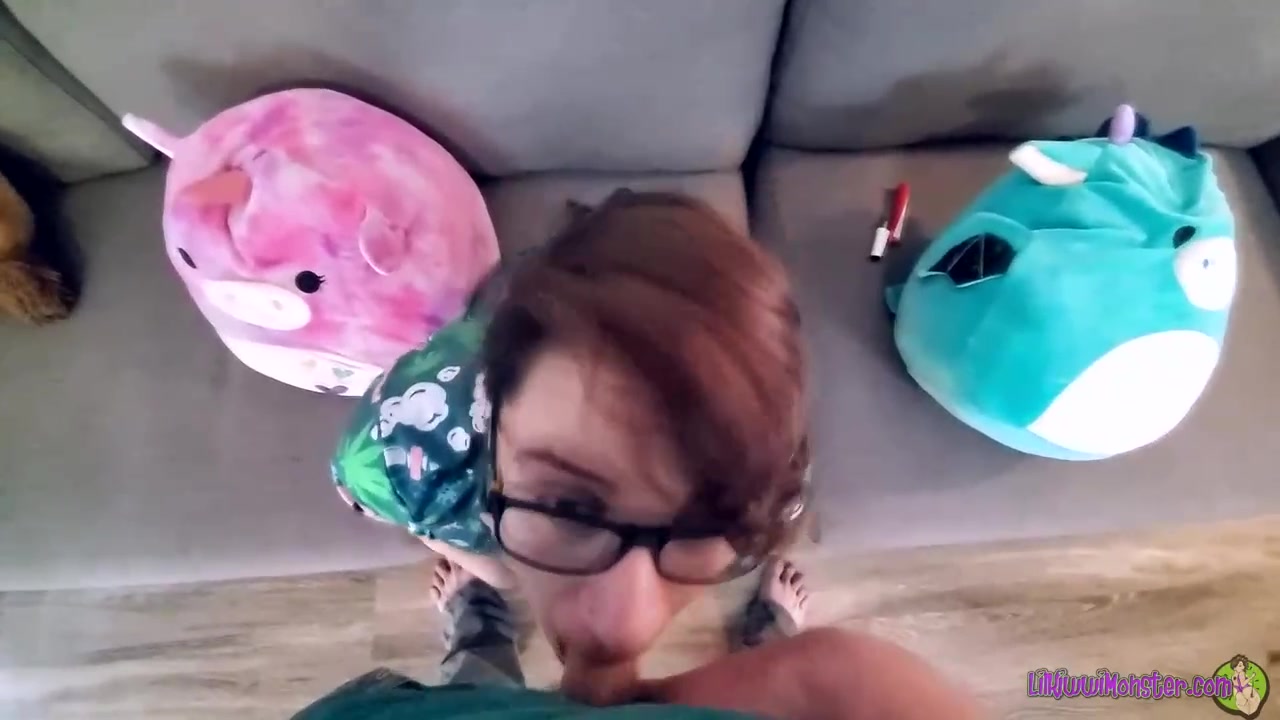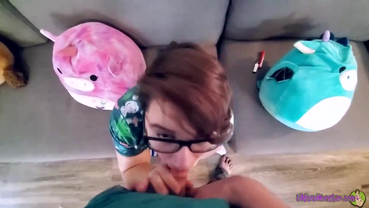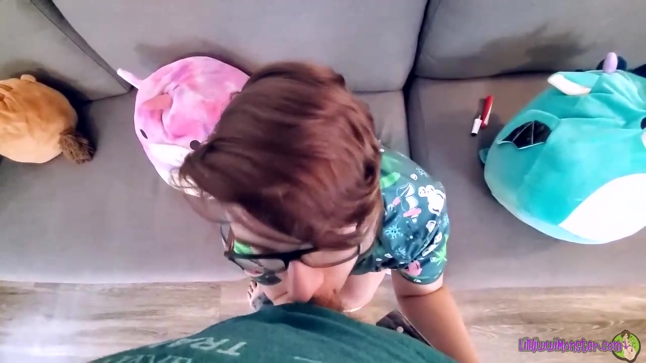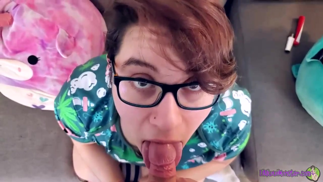 Super-Fucking-Hot teenager black-haired with glasses is getting on all fours on the floor and deep throating man meat like a real professional