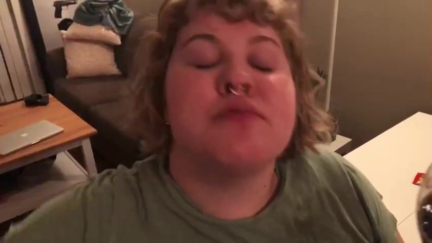 Meaty fuckslut, Alice is licking and demonstrating her large abdomen, in front of the camera