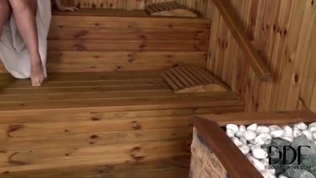Slender doll with diminutive boobs and towheaded hair is plumbing her acquaintance in the sauna