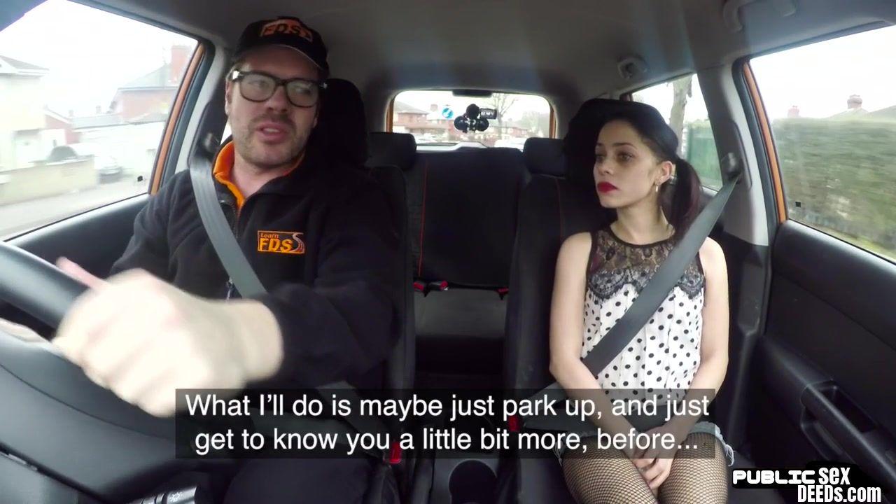 Petite british driving student rides instructor on front seat to pass