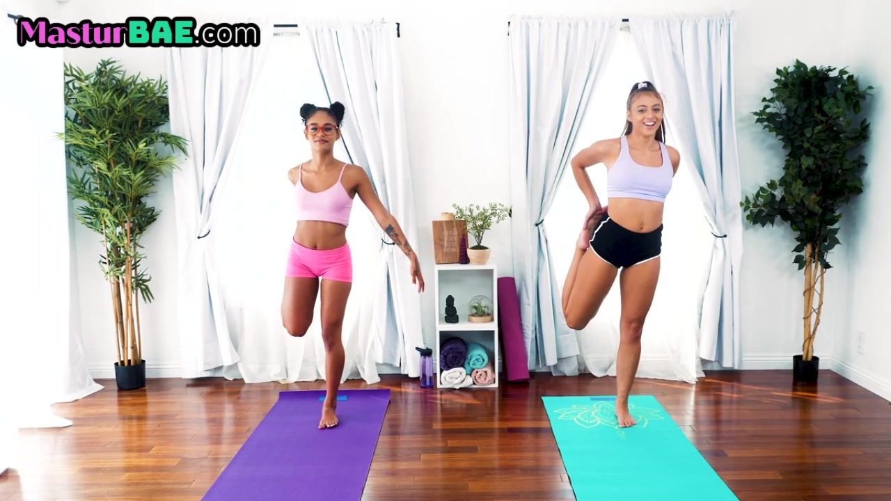 Black yoga babe stretches and works out then is pussylicked by white dyke babe