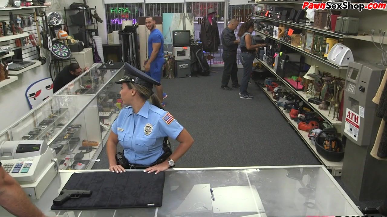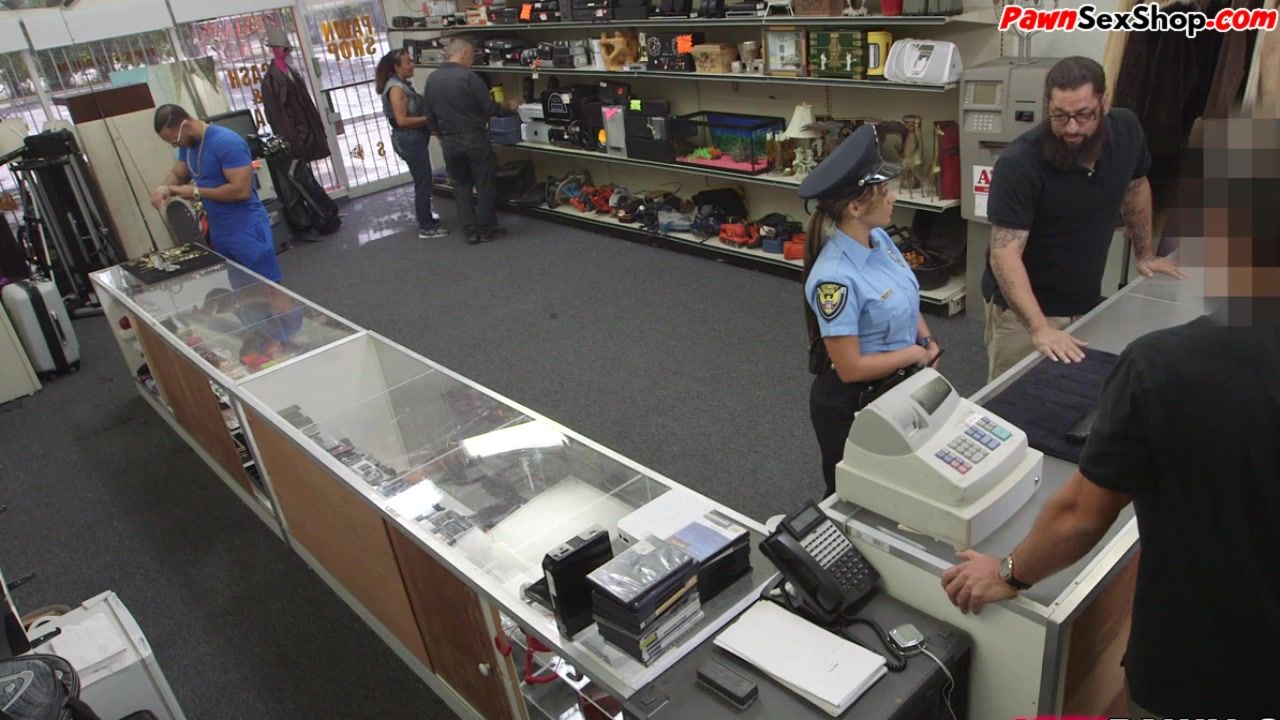 Cop uniform hottie caught hard riding huge cock in pawnshop