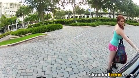 Crimson haired doll is throating man meat and getting romped in the truck, during the day